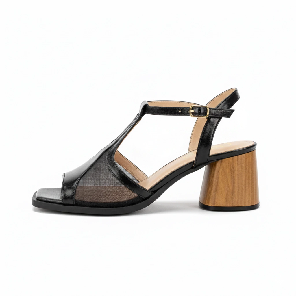 Sandália feminina em couro legítimo, com detalhe moderno em tela lateral respirável, tiras frontais e salto bloco em madeira, que garantem estabilidade e conforto. Fechamento por fivela ajustável no tornozelo e palmilha macia, ideal para looks casuais e elegantes.